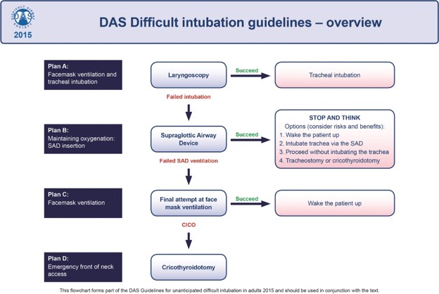 Hagberg, C.A., Gabel, J.C. and Connis, R.T., 2015. Difficult Airway Society 2015 guidelines for the management of unanticipated difficult intubation in adults: not just another algorithm. BJA: British Journal of Anaesthesia, 115(6), pp.812-814. DAS Intubation Guidelines (2015)