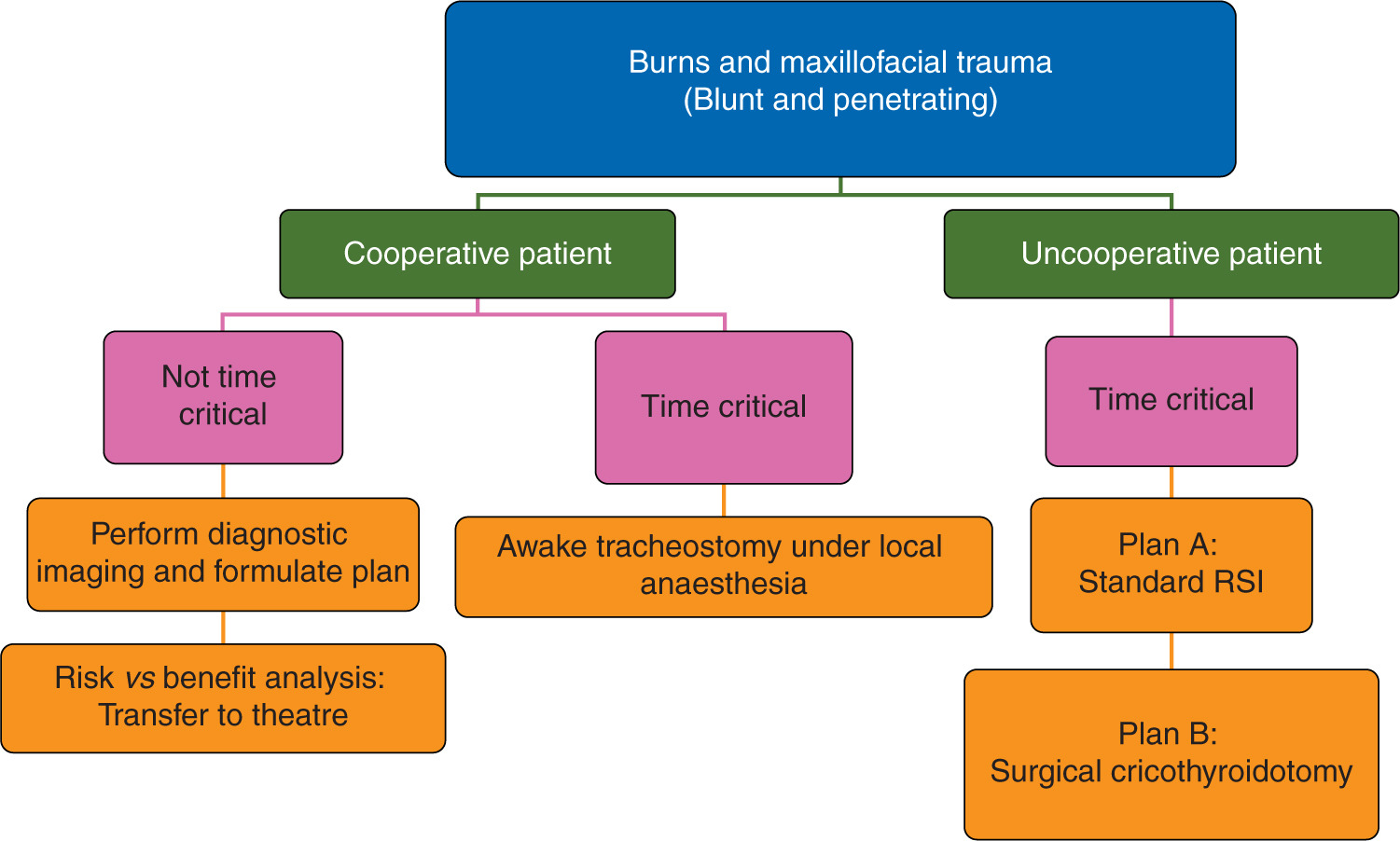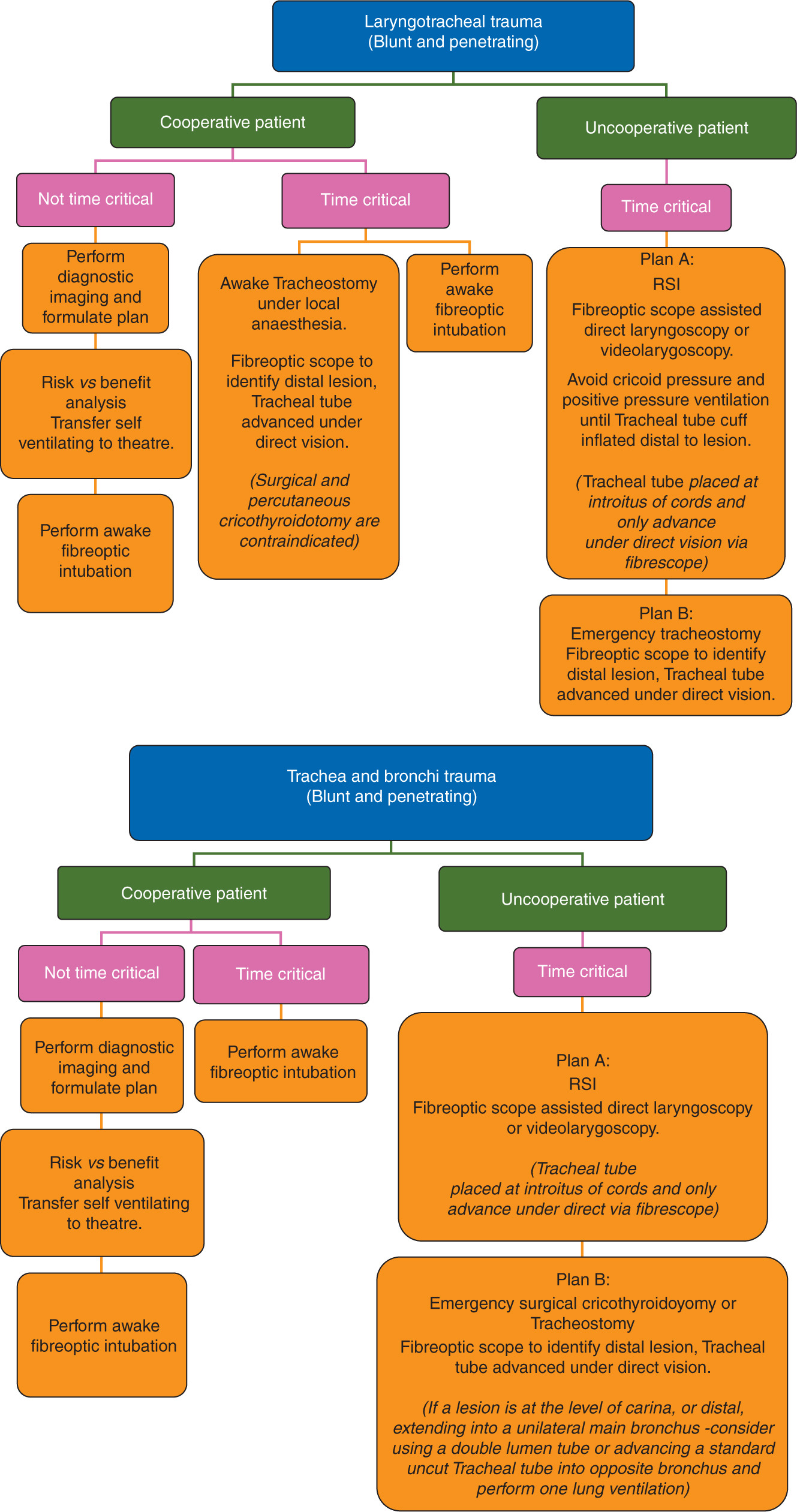A recently published metanalysis has been used as the foundation for this guidance. Airway management in patients with airway injury focuses on maintenance of spontaneous ventilation if at all possible, intubation under direct vision (to avoid the creation of a false passage) and the avoidance of both PPV and cricoid pressure during RSI is recommended. In case of failed intubation surgical tracheostomy is the rescue plan most likely to avoid making the situation worse. When managing burns patients the Difficult Airway Society 2015 guidelines apply.