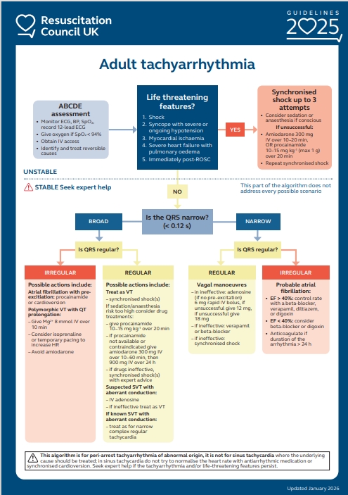 This guideline describes the resuscitation of patients with tachyarrhythmia in the emergency setting. It also considers Prolonged Casualty Care and Paediatric circumstances. There are separate guidelines for managing stable patients presenting with new tachyarrhythmias such as atrial fibrillation (AF) or atrial flutter.
