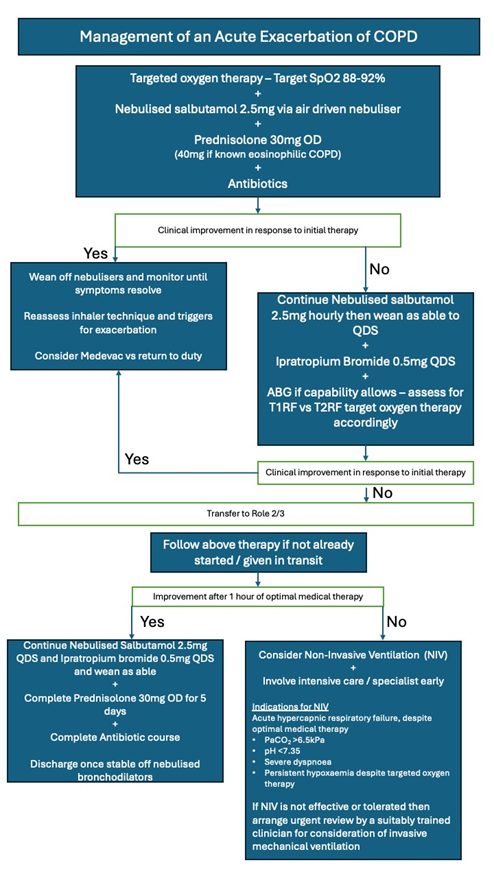 COPD is a respiratory condition which may present in the deployed setting as a poorly controlled chronic condition, or as an acute exacerbation characterised by obstructive lung pathology. Treatment is aimed at reversing the underlying cause and managing symptoms.