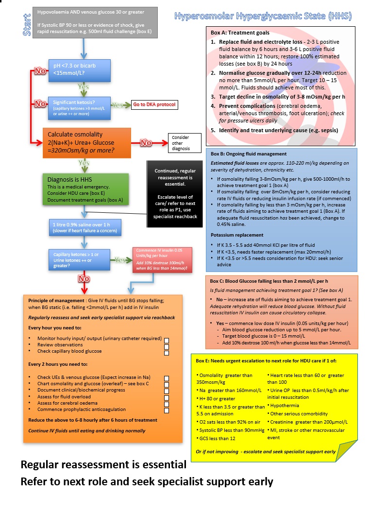 2.Normalise glucose gradually over 12-24h reduction no more than 5mmol/L per hour. Target 10 – 15 mmol/L. Fluids should achieve most of this.